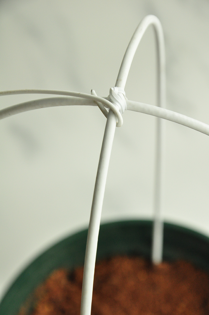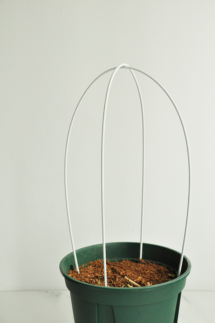 将这两根铁丝呈十字交叉状插入花盆土中,要感觉到铁丝的末端都接触到了花盆底部。