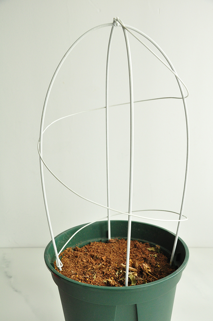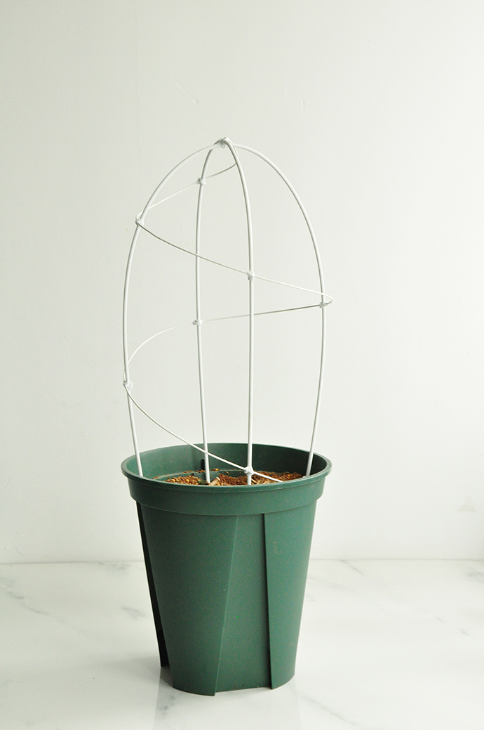 将盘线围绕着花架从上向下缠绕几圈,一直到接触花盆边缘的位置,然后固定在其中一根铁丝上。