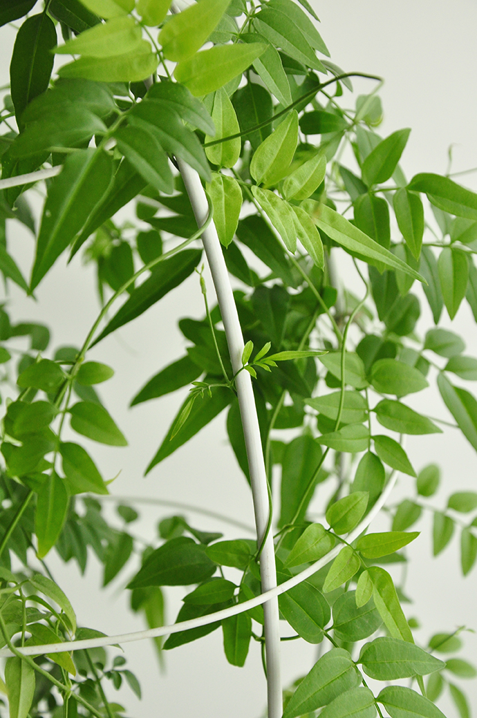 因为是示范,所以小意达拿了空花盆来演示,大家在实际操作中最好是把小苗栽好之后再做花架。这是小意达年初种的一棵多花素馨小苗,小半年过去已经长到这么大,期待它明年春天花开满架!