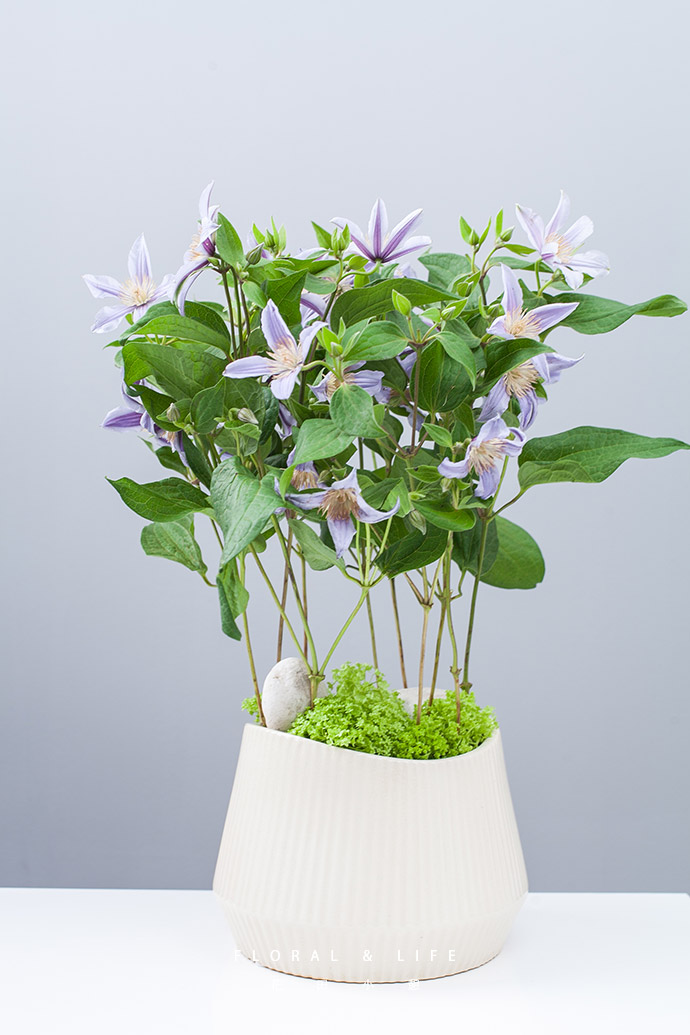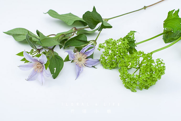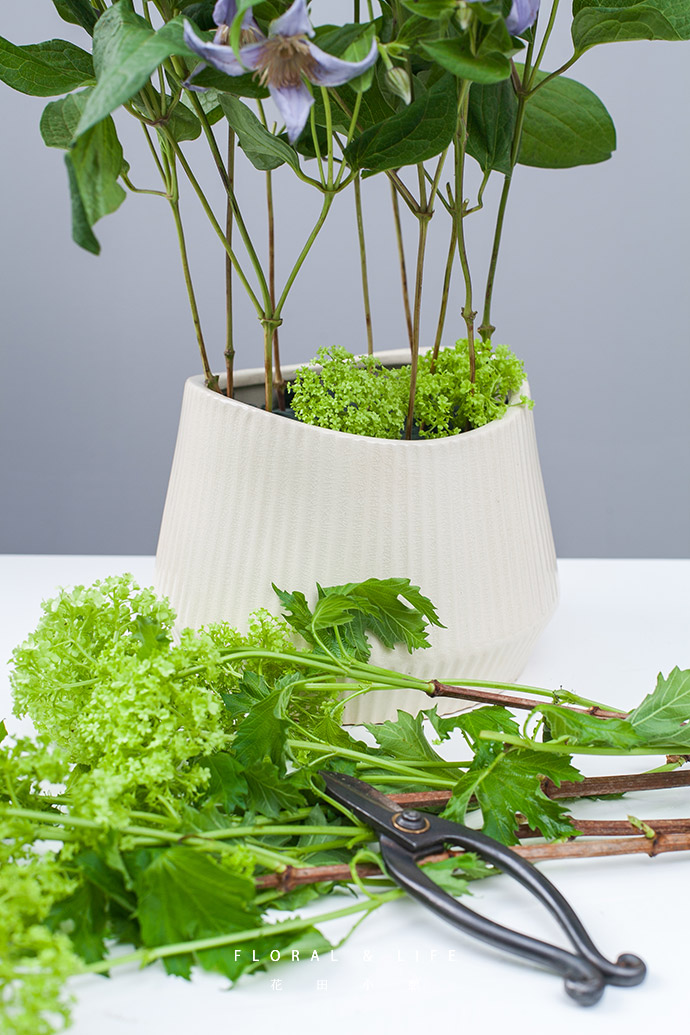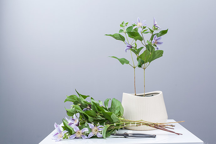 将铁线莲整理一下,去掉那些不好的花瓣和底部的叶子。