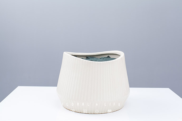 选择一个白色的陶器,花泥装在距离瓶口2cm的位置为佳,这样浇水的时候不容易流出来。