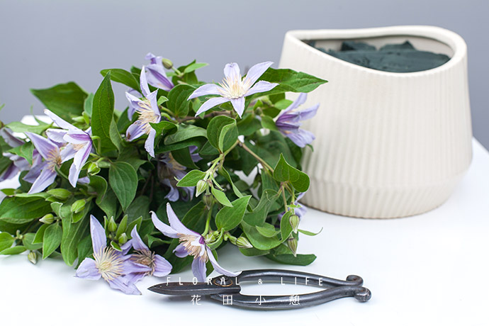 为了方便大家在花材搭配时的选择,花田小憩APP特设香味等级图谱,供大家在学习过程中了解更多植物的属性,以方便作品选择更适合的空间位置陈列。选择一个白色的陶器,花泥装在距离瓶口2cm的位置为佳,这样浇水的时候不容易流出来。