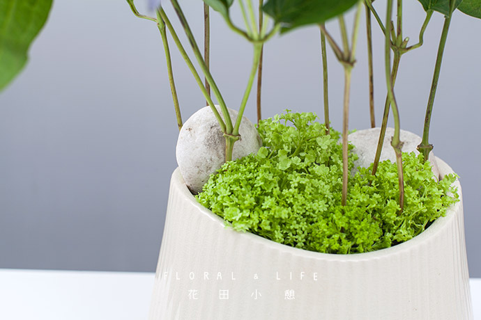 配上2颗白色的鹅卵石,除了视觉的配重,让作品的增加一些自然的气息。