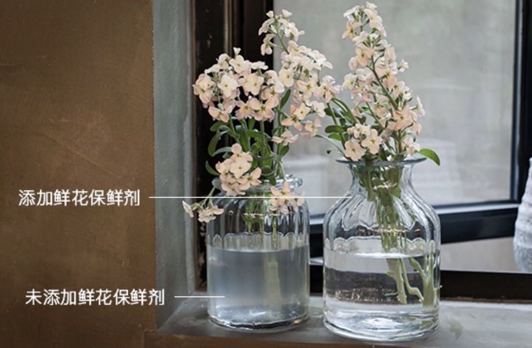 保鲜剂主要有两个功能:一是杀菌,二是供给花朵所需的营养。夏日,保鲜剂是必备用品,不仅能让花朵常保新鲜,也可让花苞容易绽放。注意加入保鲜剂后仍然需要每天换水,并在水中补充保鲜剂。