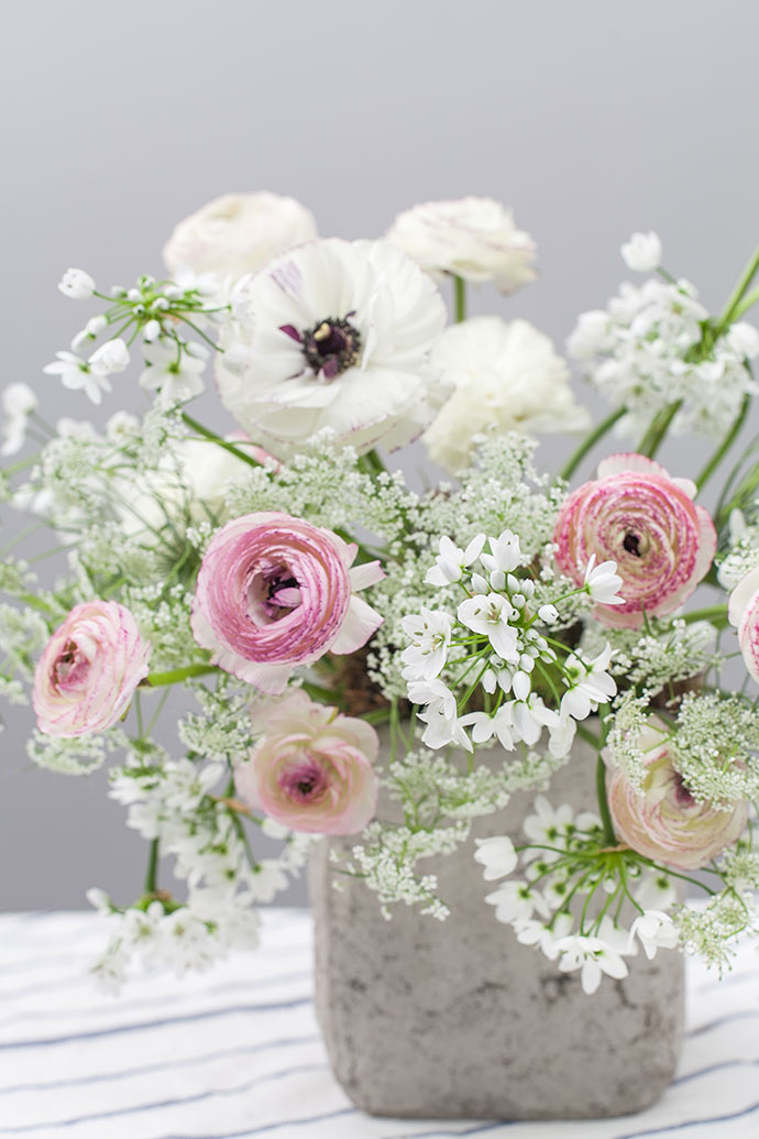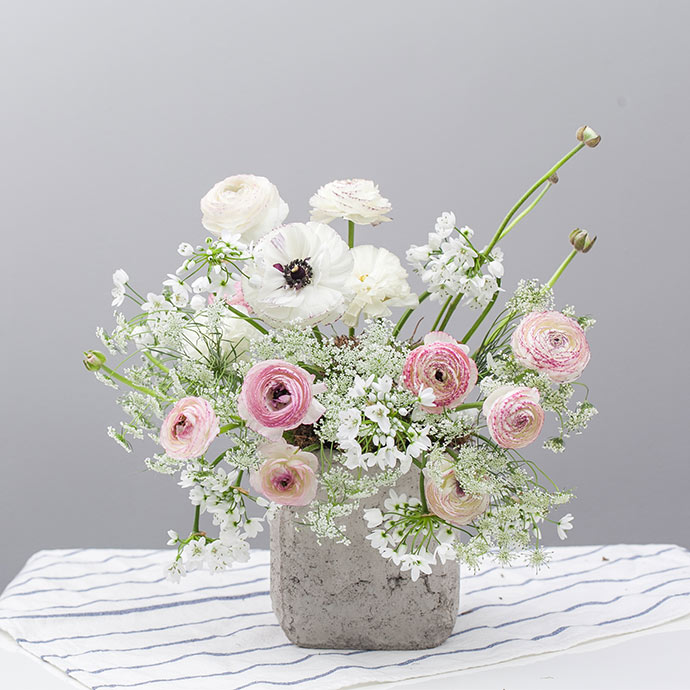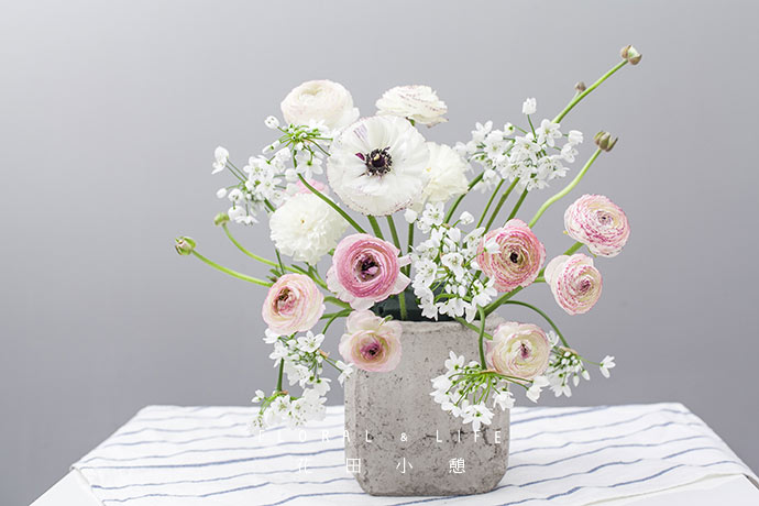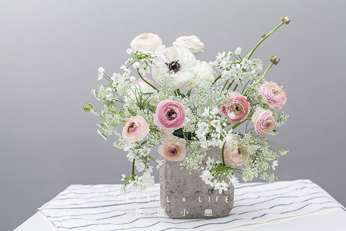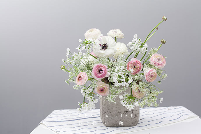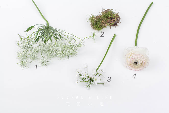 在洋牡丹剩余的空间里长短不一的插入白色韭菜花。