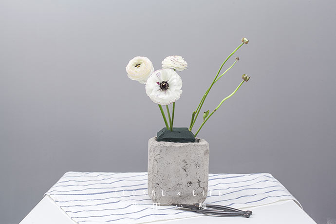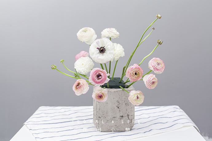 先插入一丛白色的洋牡丹和花苞,注意两侧的视觉平衡。