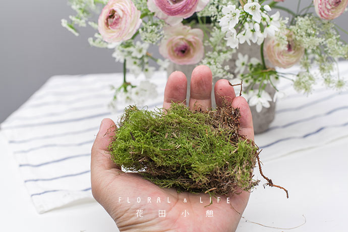 用绿色的苔藓把露出来的花泥进行遮盖。