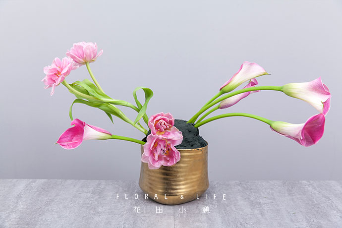 在花器内放入花泥,比瓶口高出适宜高度,向作品中插入极具线条律动感的马蹄莲和郁金香,勾勒作品的轮廓。