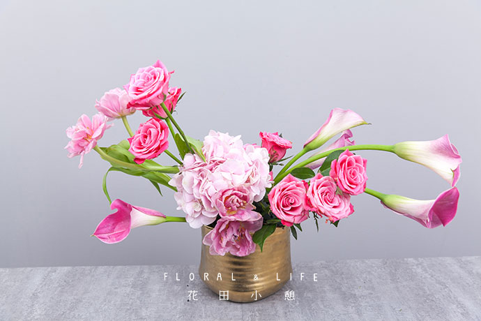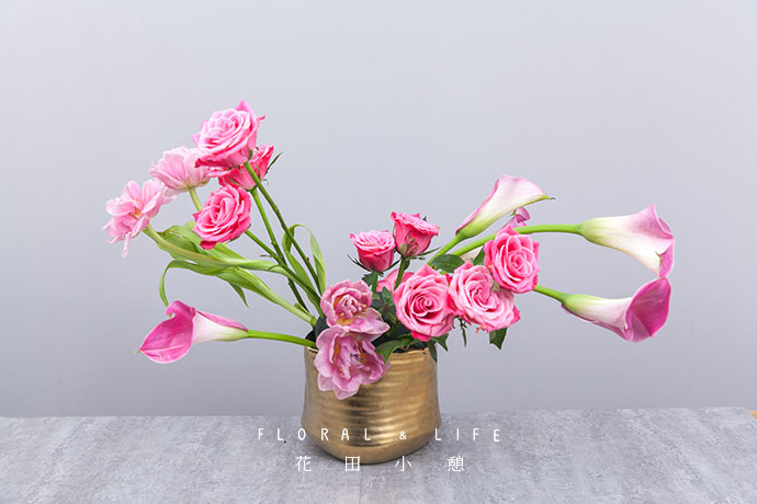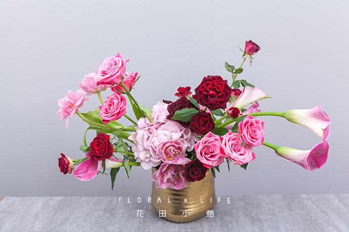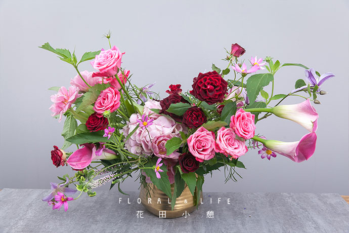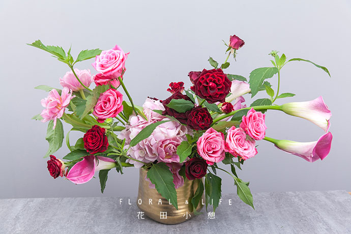 最后插入轻柔的铁线莲、波斯菊和鼠尾草,作品完成。花园中种满了寓意爱情的花朵,金色花器与红色花材的搭配,雕刻出流光溢彩的绚烂。这是一座以爱之名的秘密花园,充满了魅惑、神秘与浪漫。