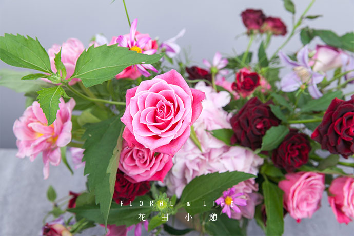 继续加入多头玫瑰,一抹浓烈的红色为作品增添了别样的风情。