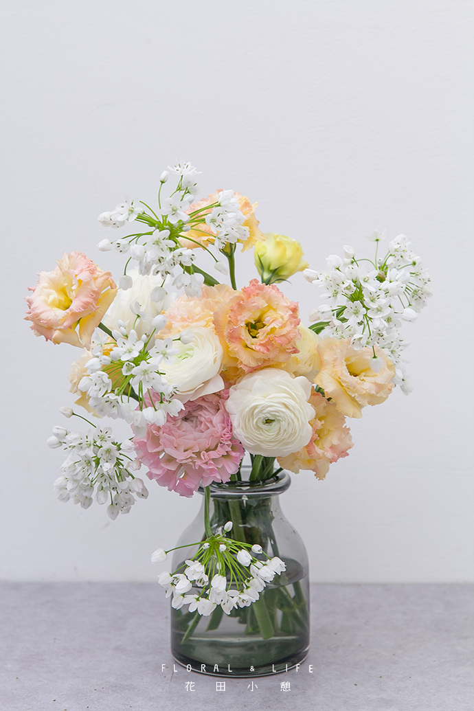 在洋桔梗和花边洋牡丹之间的空隙中添加几支纯白色洋牡丹,丰富作品颜色层次。