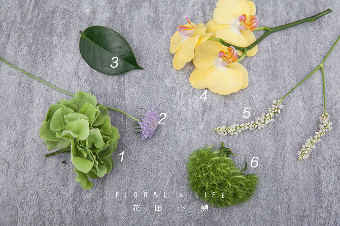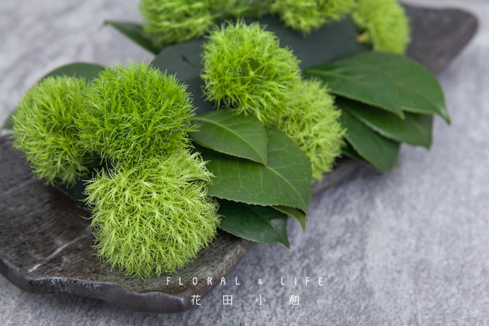 为了方便大家在花材搭配时的选择,花田小憩特设香味等级图谱,供大家在学习过程中了解更多植物的属性,以方便作品选择更适合的空间位置陈列。将石竹球以组群的方式两三支聚集一起,插入泡好的花泥中。