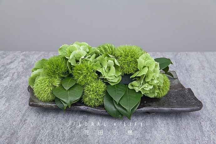 花泥仍裸露的部分用绿色绣球遮盖,打底完成。