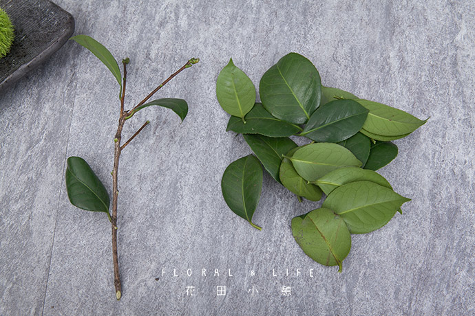 向花泥侧面垂直插入山茶叶,遮挡花泥。