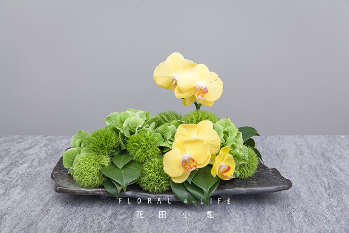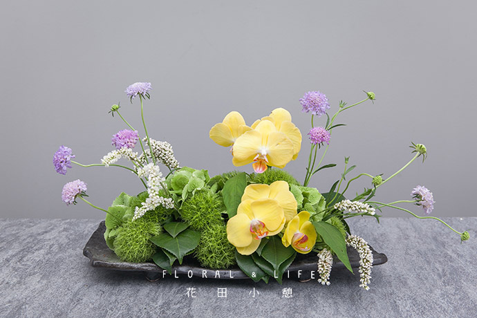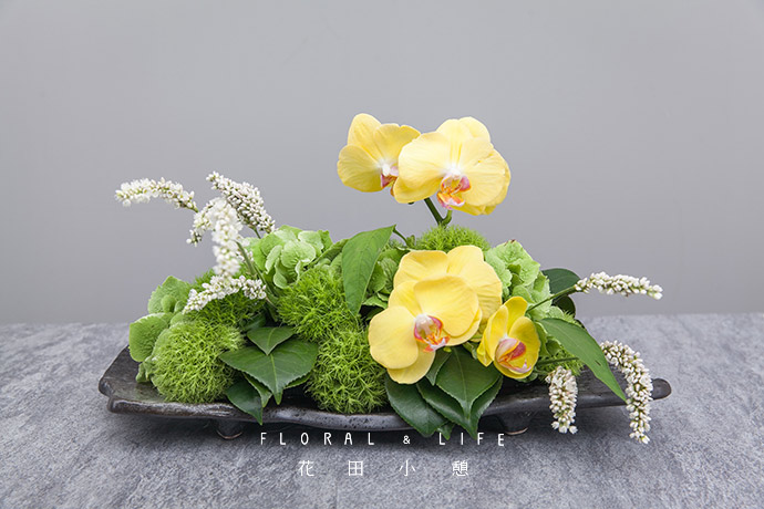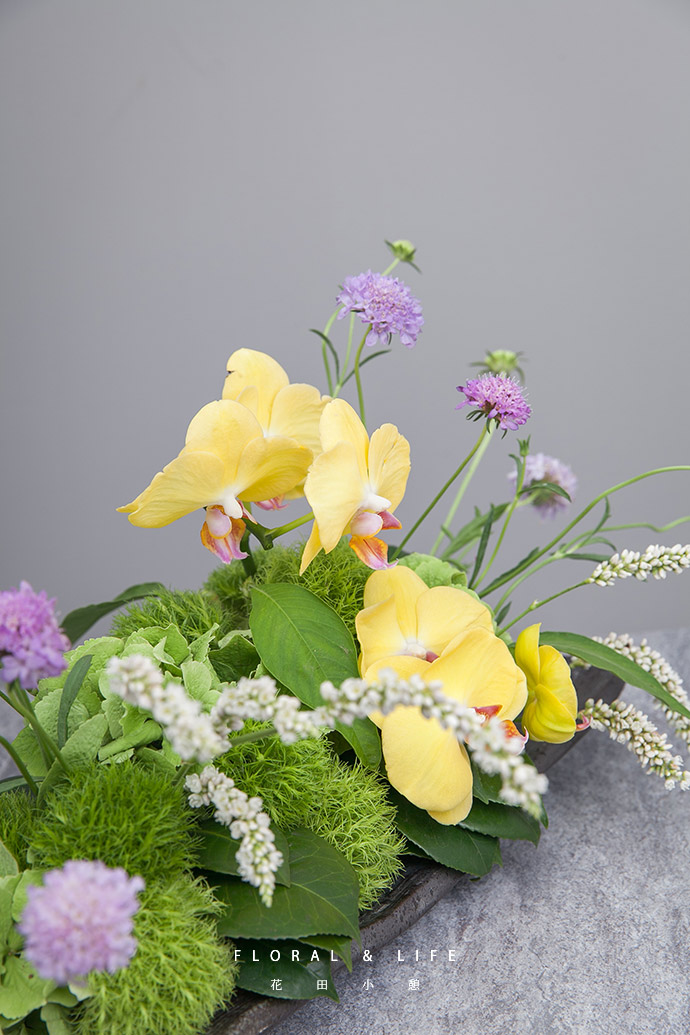 继续向作品中插入花姿优美的蝴蝶兰,成为作品的焦点花。