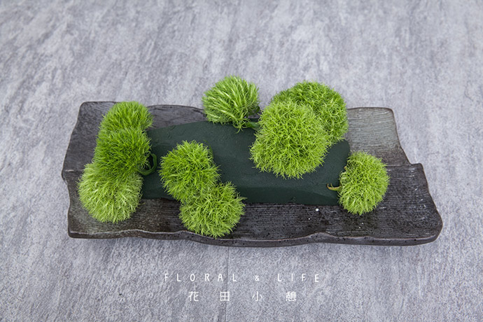 将石竹球以组群的方式两三支聚集一起,插入泡好的花泥中。