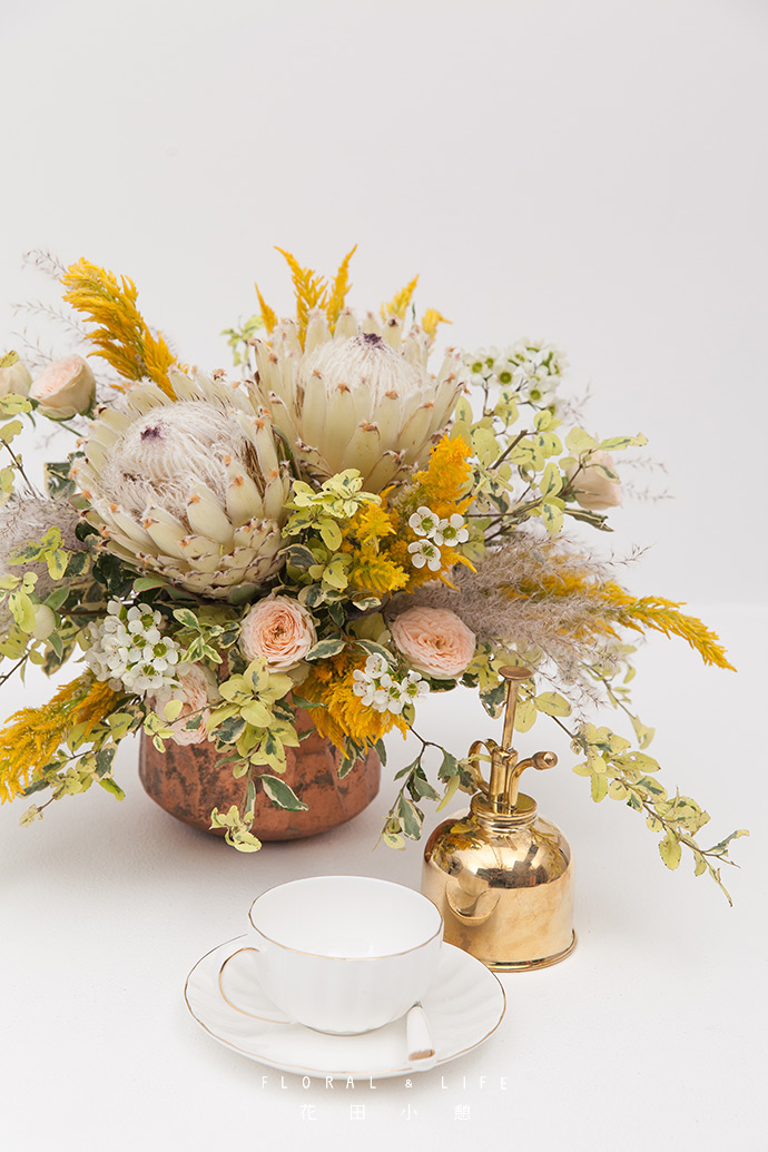 花器有各式各样的形状,它们虽然都是盛放花材的介质,却肩负着更重要的使命。好的花器和花材只有相互衬托,才能成为一个完整的作品。如果两者搭配不和谐,会使花材和花器分离,有碍观赏。本期作品用到白色帝王、黄色火炬等浅色系花材,根据这些花材的特性选择了一款微微收口的黄铜色花器。