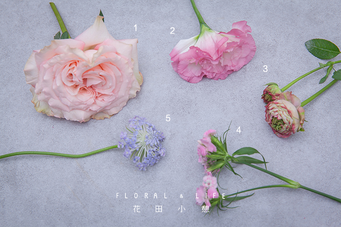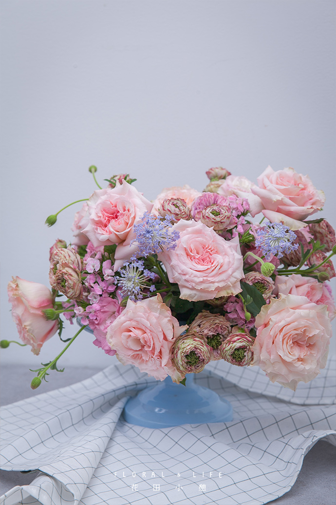 若感觉单调的粉色不多变迷人,那用点儿与粉色搭配的小碎花丰富作品也不失为一个好的选择。例如蓝盆花、木绣球等花材。