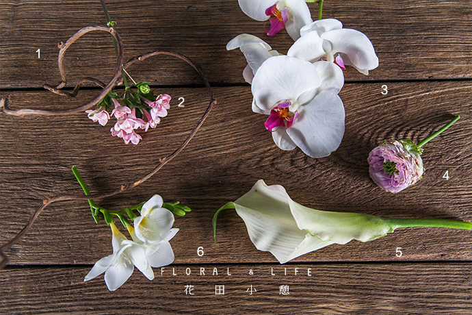此时观察作品,能看到大花蕙兰与花器连接处略显不和谐,我们能用与粉色相搭配的颜色的花材中和。当然,不能抢了主花材大花蕙兰的风头。本期我用到的是海芋和小苍兰两种植物。味道浓郁的小苍兰和大花蕙兰的混搭味道,点燃家里的浪漫因子。