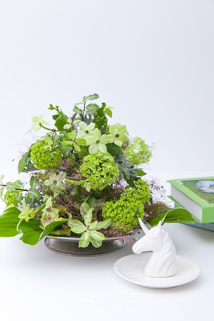 由于前期铺垫了很多雾状花材和线条感极佳的叶材,用小兔葵和木绣球插制作品,能轻松营造出高低错落的空间感。