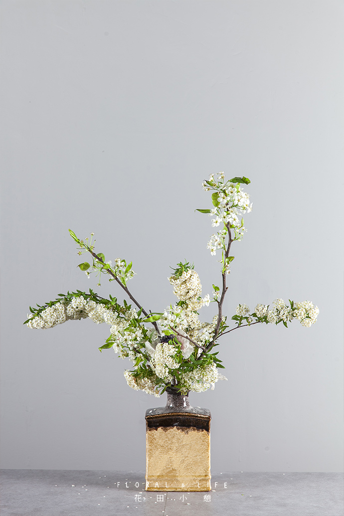 将浪漫的白色系花束插制到古典主题的花器里,组合成优雅的自然风景。四处弥漫着花儿的香气,嗯,春天的记忆里就该有梨花的身姿。