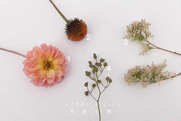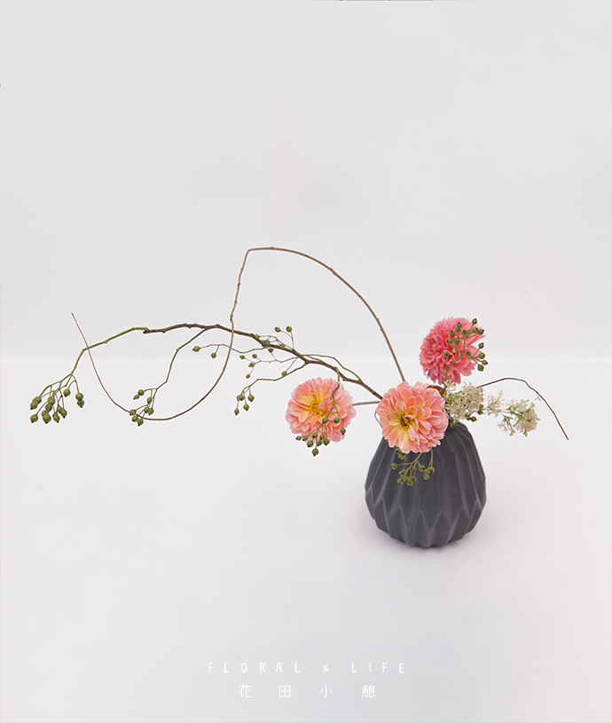 小丽花花色鲜艳,用它做作品的焦点主花材,能提升作品的高品质感。