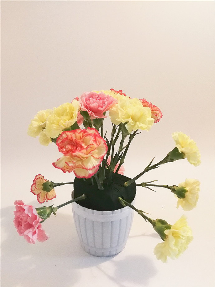 康乃馨花型本身有弧度,插的时候,要注意与整体作品的弧度一致。