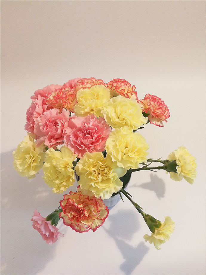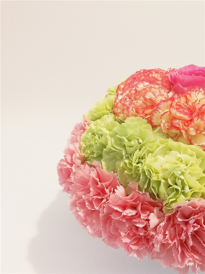 康乃馨的花型本身有弧度,搭好骨架之后,调整每朵花的高低和大小,确保整体半圆形的弧度。花与花之间不能留有空隙。这个简单的桌花也充分表达了家庭插花的愿景——简单而温暖,信手拈来却又与众不同。