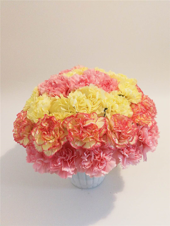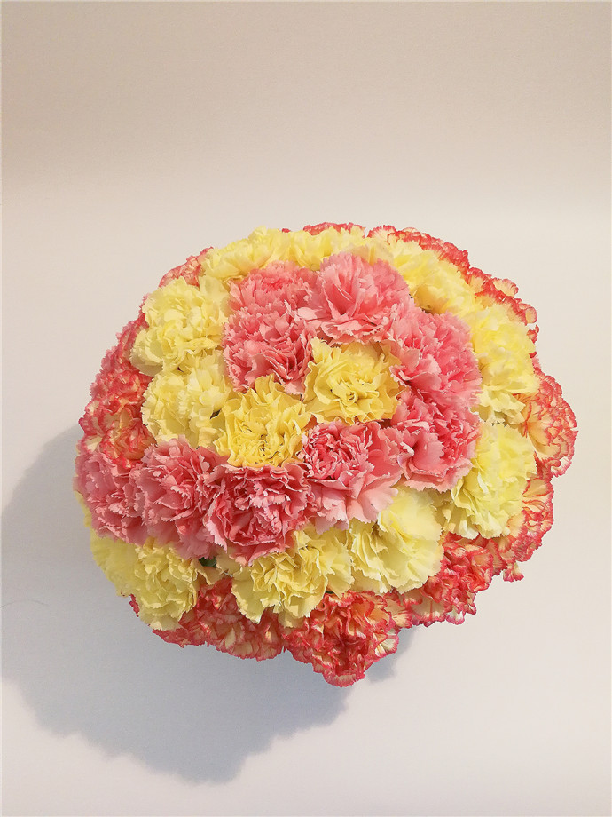 从中心点的那支黄色康乃馨开始,两两颜色交替,插成螺旋式。