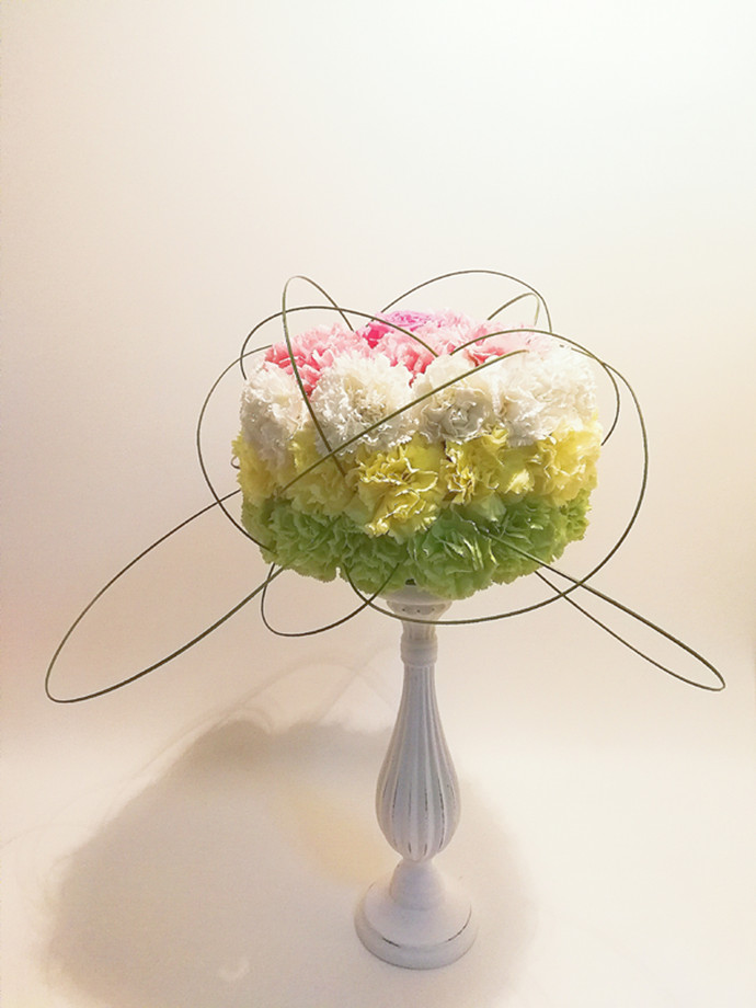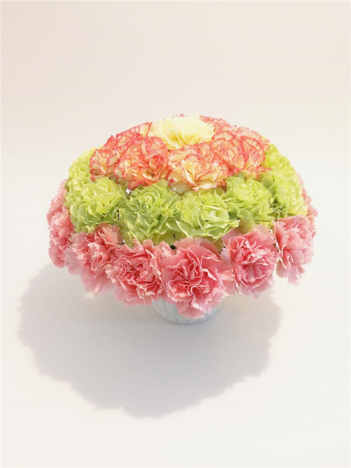 康乃馨的花型本身有弧度,搭好骨架之后,调整每朵花的高低和大小,确保整体半圆形的弧度。花与花之间不能留有空隙。