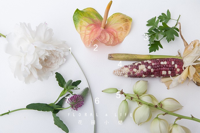 即使是一根玉米,也能在花艺设计里面大放异彩。将玉米的外皮全拨掉,露出里面紫色的果实备用。