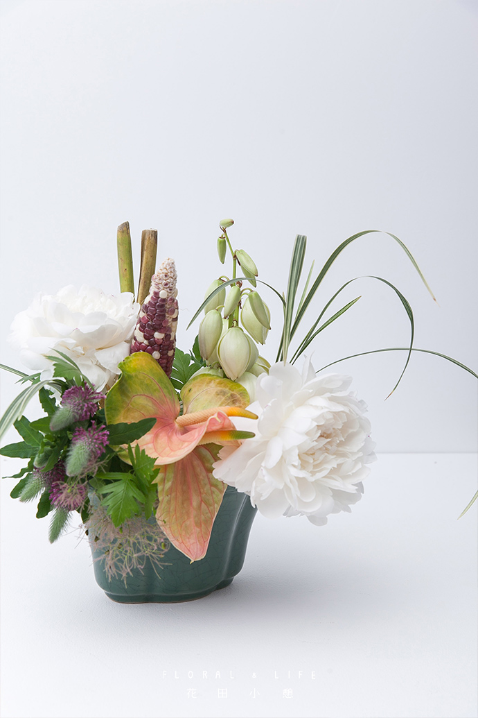 在玉米的对立位置等比插入凤尾丝兰。凤尾丝兰在花市的俗称是“宝塔”,因为形似宝塔得名。而日常生活中也能经常看到凤尾丝兰,街道绿化带、公园里都能看到,而且现在正好是它的花期,周末逛公园,下班路上可以留意一下街道边哦。
