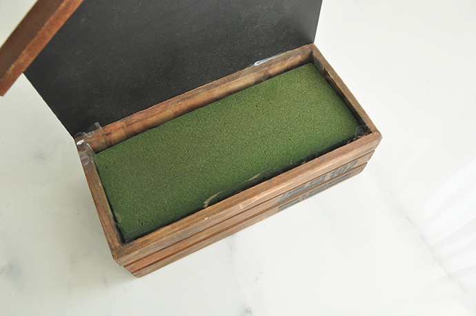 将吸饱水的花泥切割成合适的大小,隔一层防水的玻璃纸放入花器中。