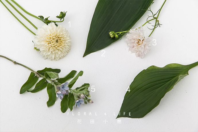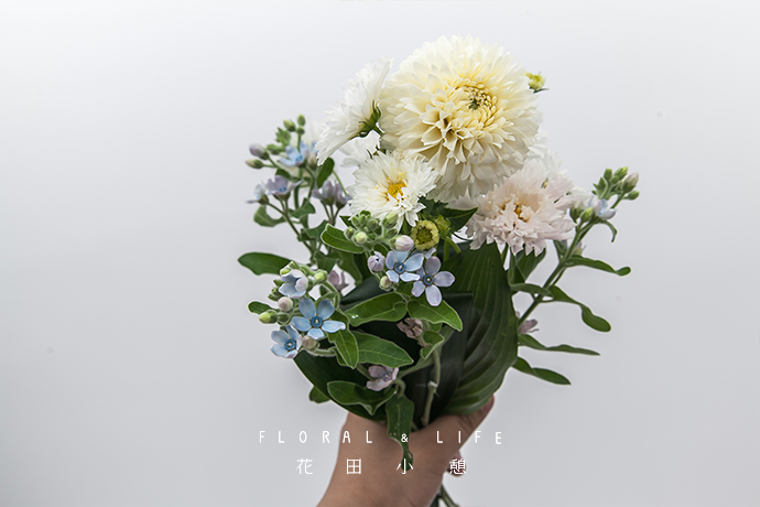 — 步骤 —本次将小丽花作为花束的主花材,优雅而有魅力。选取一支茎秆直立、花头品相好的小丽花握在手心位置,把一叶兰对折放在小丽花茎秆附近,可以为花材之间隔开空隙。