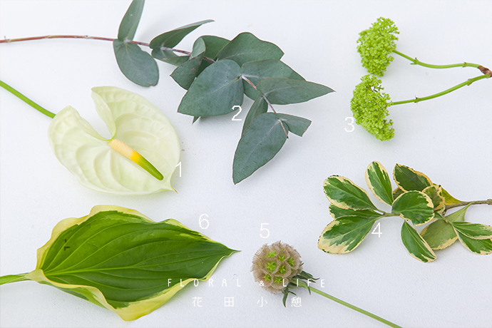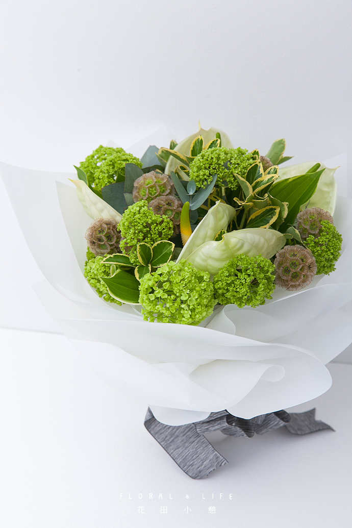 整个作品偏白绿色系,花材之间有些高低差,虽不是100%的半圆形,但由于整体平衡感很强,乍一看还是相当可爱的。这次制作的花束以绿色为主色调,表现出冷静沉稳、清爽利落的气质,如果只有绿色会让人觉得太过冰冷生硬,加入白掌和白色包装纸,让花束看起来更柔和、自然。