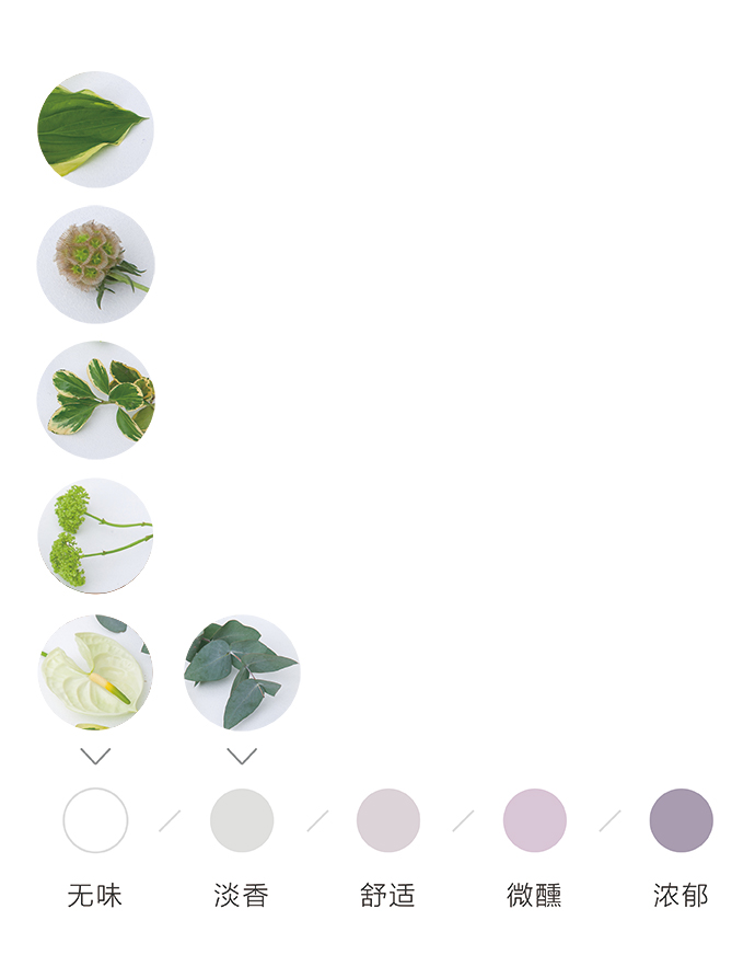 为了方便大家在花材搭配时的选择,花田小憩APP特设香味等级图谱,供大家在学习过程中了解更多植物的属性,以方便作品选择更适合的空间位置陈列。