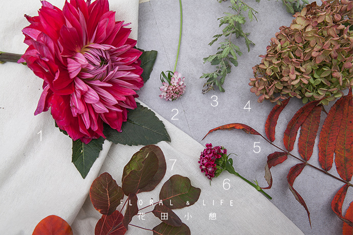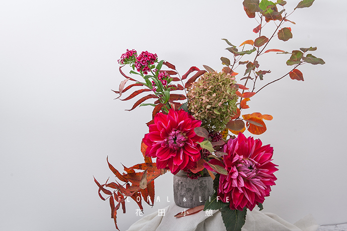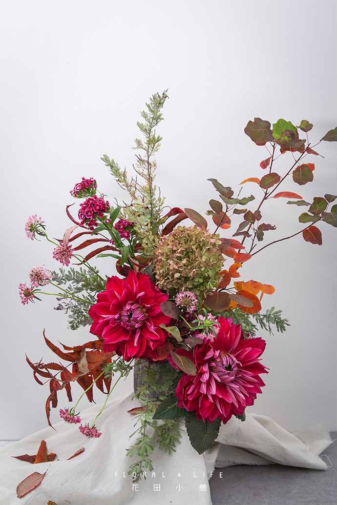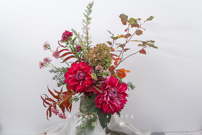 把蓝盆花加到作品中,其颜色嫩粉,完美地中和了大丽花的艳粉和椿树的红黄色。花型奇特,花杆细长,拉伸作品维度;增加作品跳跃性,更显活泼。