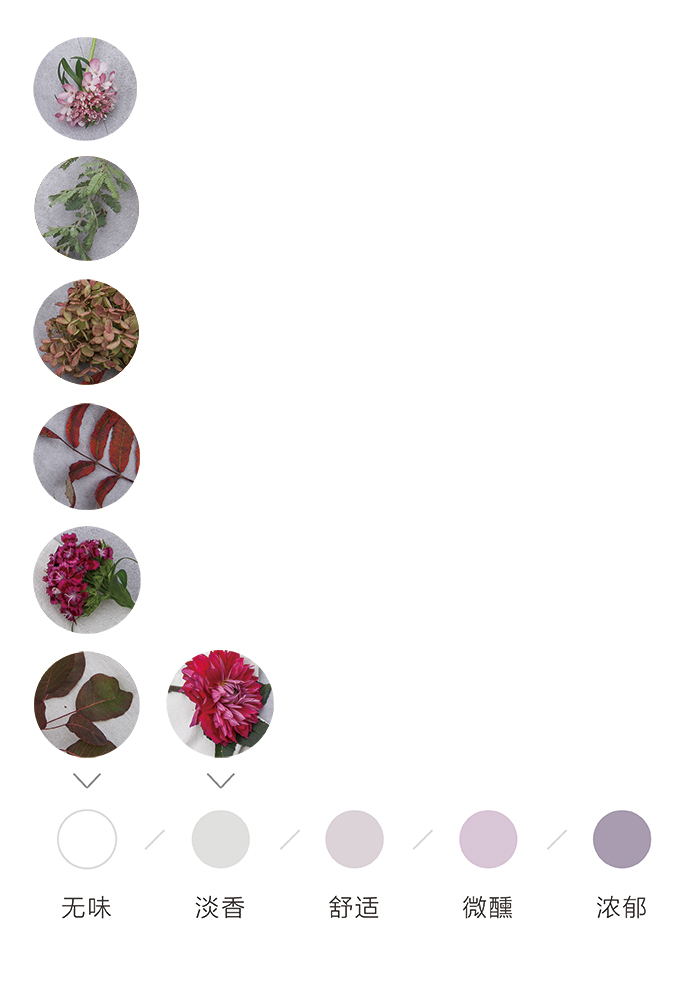 为了方便大家在花材搭配时的选择,花田小憩APP特设香味等级图谱,供大家在学习过程中了解更多植物的属性,以方便作品选择更适合的空间位置陈列。