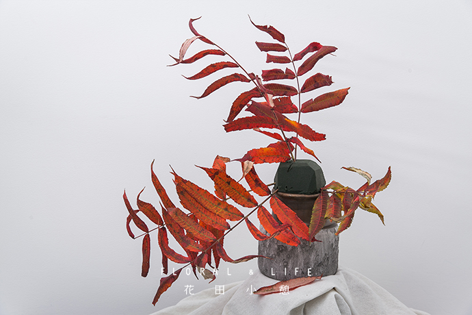 向花泥中插入椿树枝。椿树枝干形成一个简单的架构,黄色的椿树叶代表了秋天的颜色。