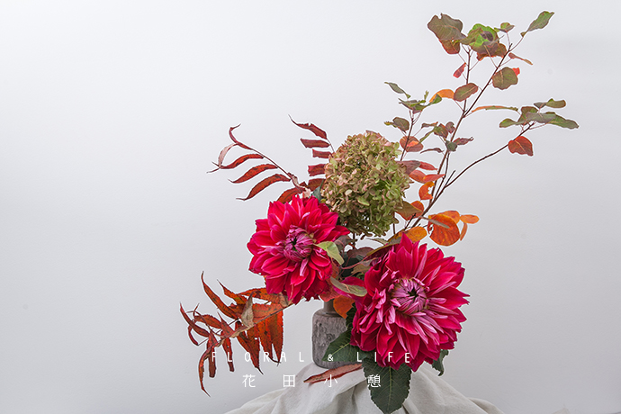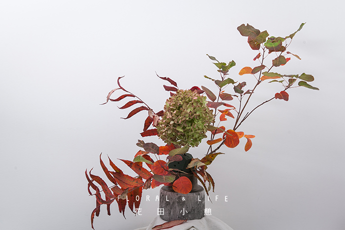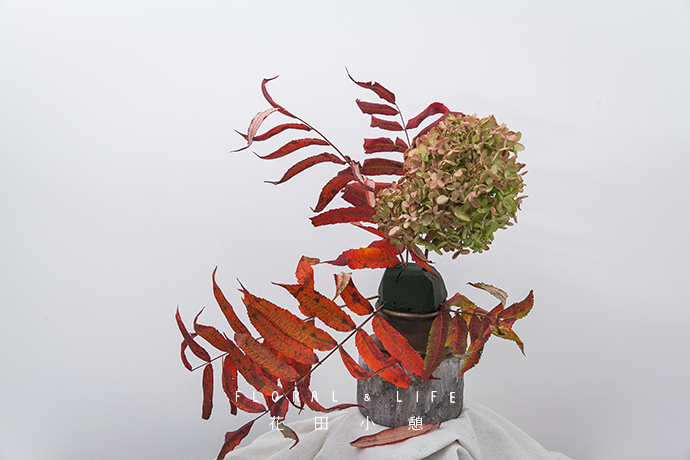 在作品的中心位置加入一支秋绣球作为焦点花材,黄绿色系的秋绣球更显朴素秋色之感。