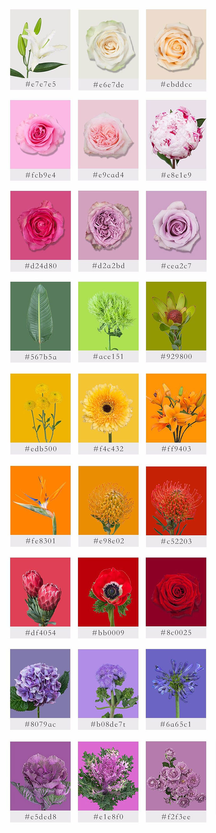 好的设计是一种习惯,配色亦如此。花艺、园艺、软装、平面等,我们每天都在和设计打交道,学习大量的色彩知识,却忘记了大自然早已给到了我们最美的配色方案。本期所分享的是每种花朵的主视觉色,既本种植物给人的第一色彩感觉。