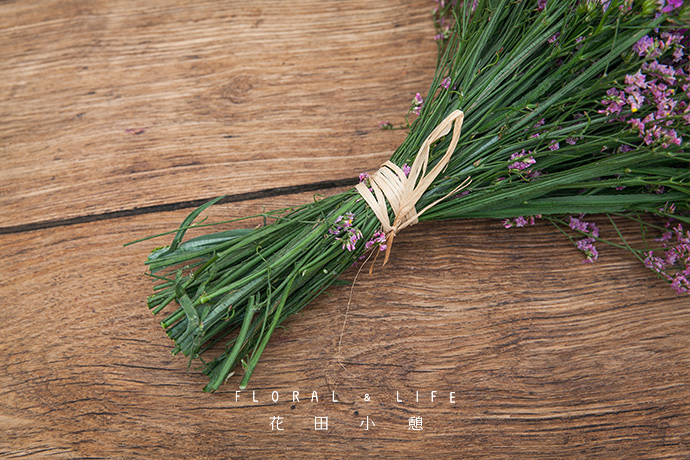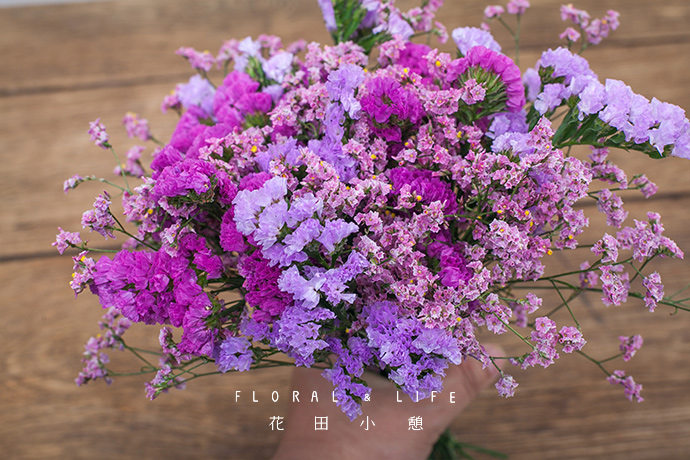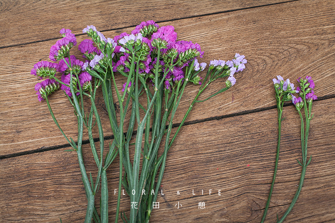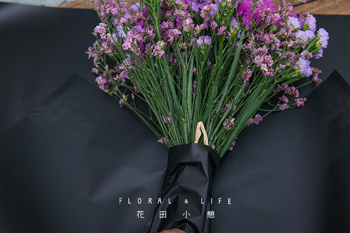 花束在制作之前的主要工作是处理花材,去掉勿忘我和水晶草多余的叶材,收拾折掉的花材。