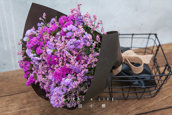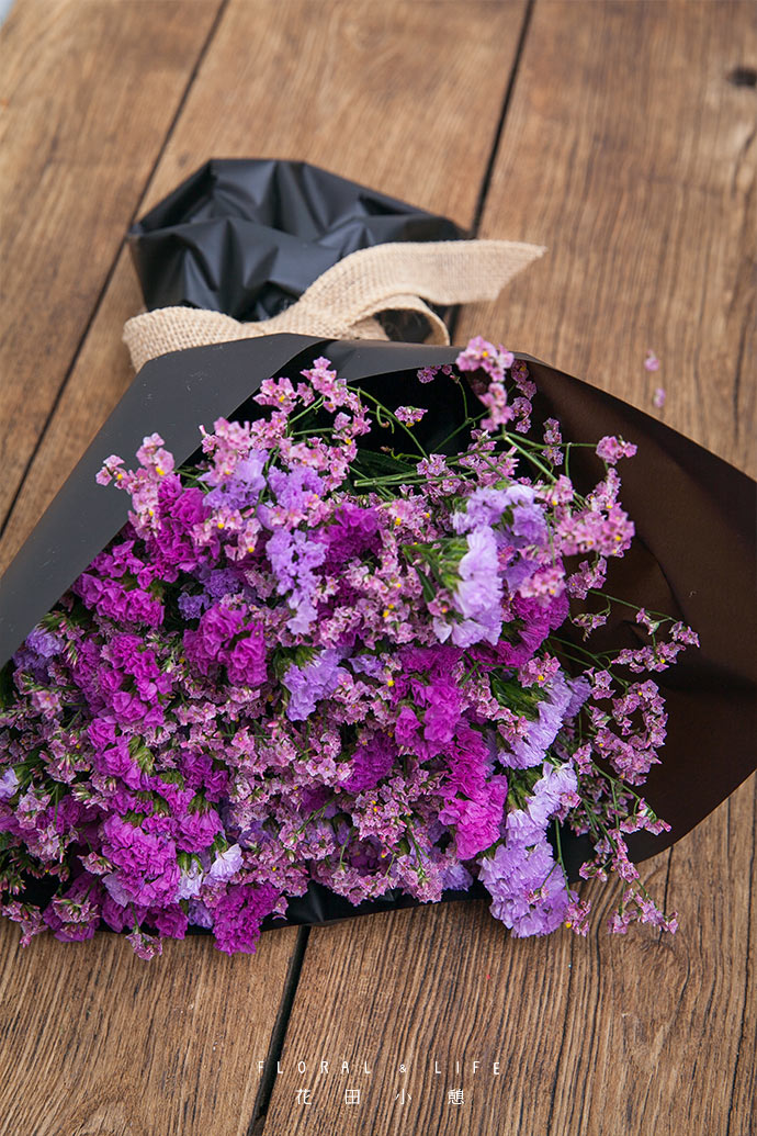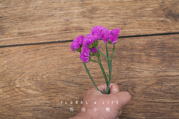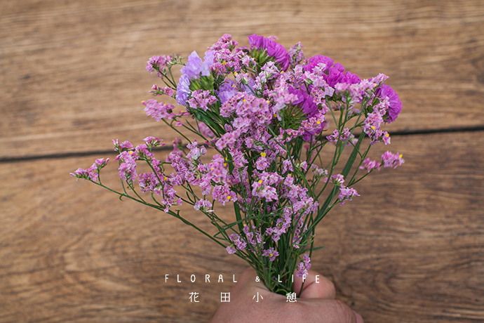 将勿忘我作为花束的中心,放在手心部位。勿忘我是紫草科勿忘我属植物,花期长,可制成干花永久保存。