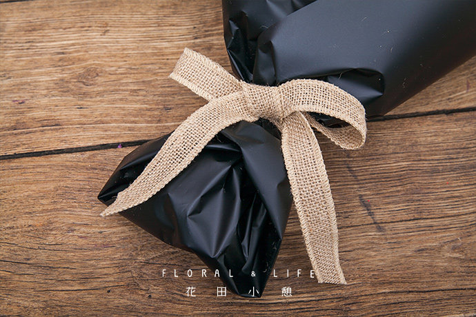 用咖色麻绳带在包装纸外侧系一个蝴蝶结。