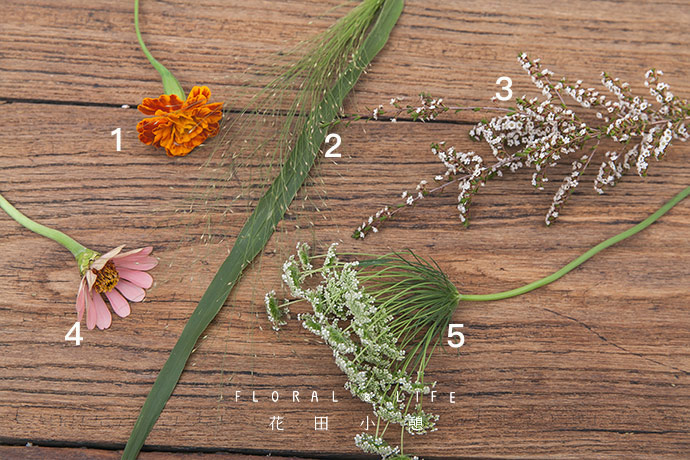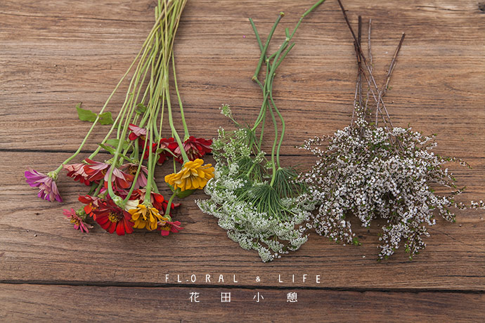 处理好百日菊、雪梅、蕾丝三种花材,百日菊是观花植物,蕾丝和雪梅是穗状花材,可直接将它们的叶材全部处理掉。