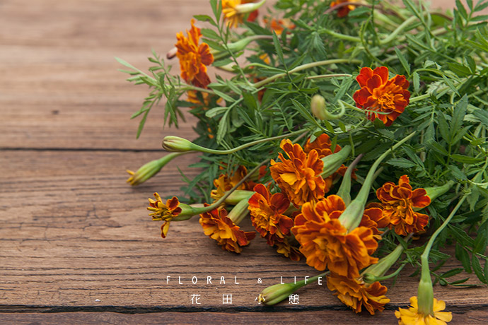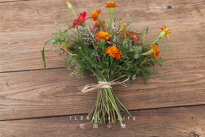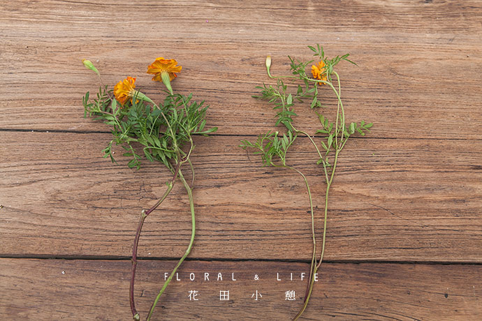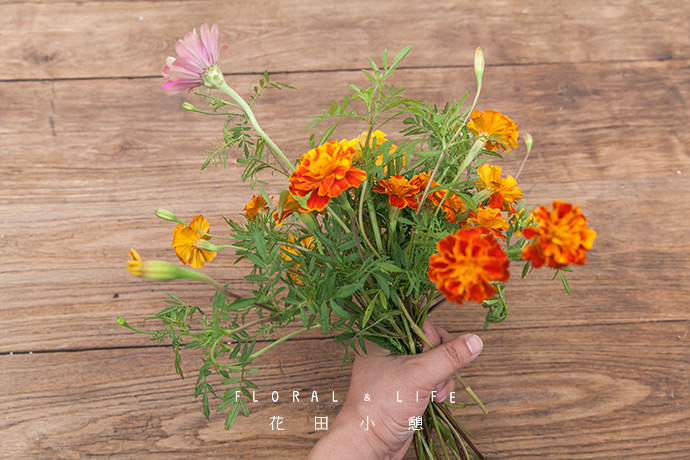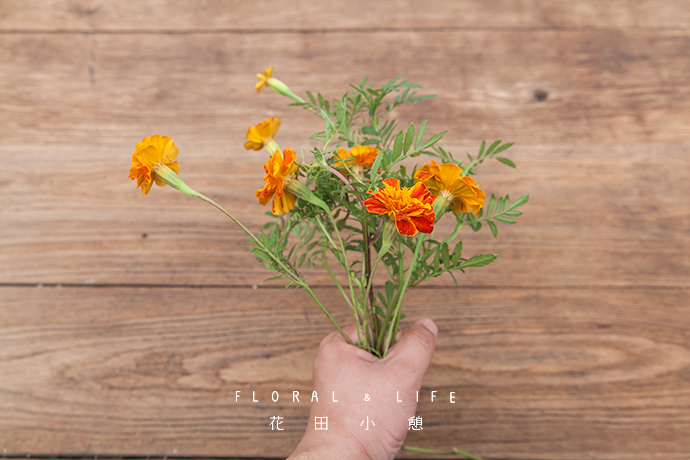 将万寿菊握在手心里,逐步添加。注意万寿菊花头朝向自然,有野生蓬勃生长的感觉最佳。