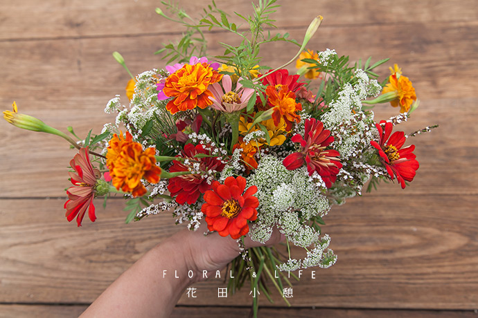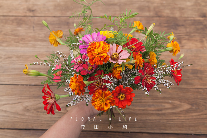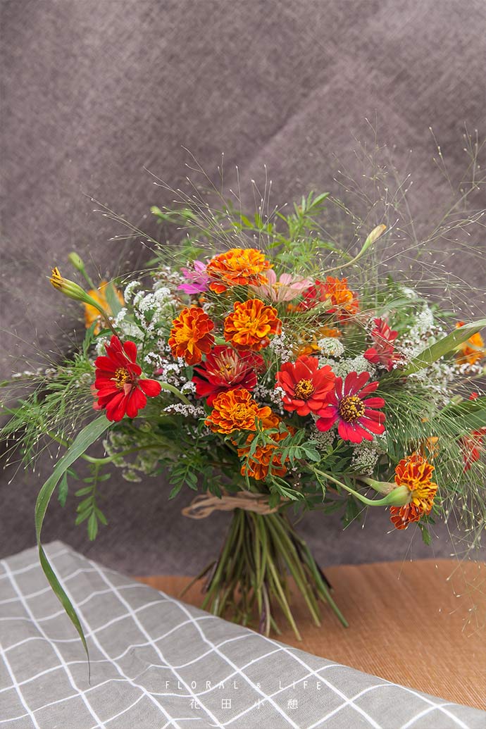 将百日菊从万寿菊花束顶端轻轻插入花束中,万寿菊恰似一个隐形的架构。百日菊颜色鲜艳风度,插花过程中注意颜色均衡。