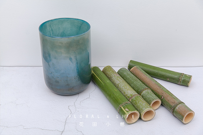 准备一个蓝色圆柱形玻璃花器和几节竹子备用。
