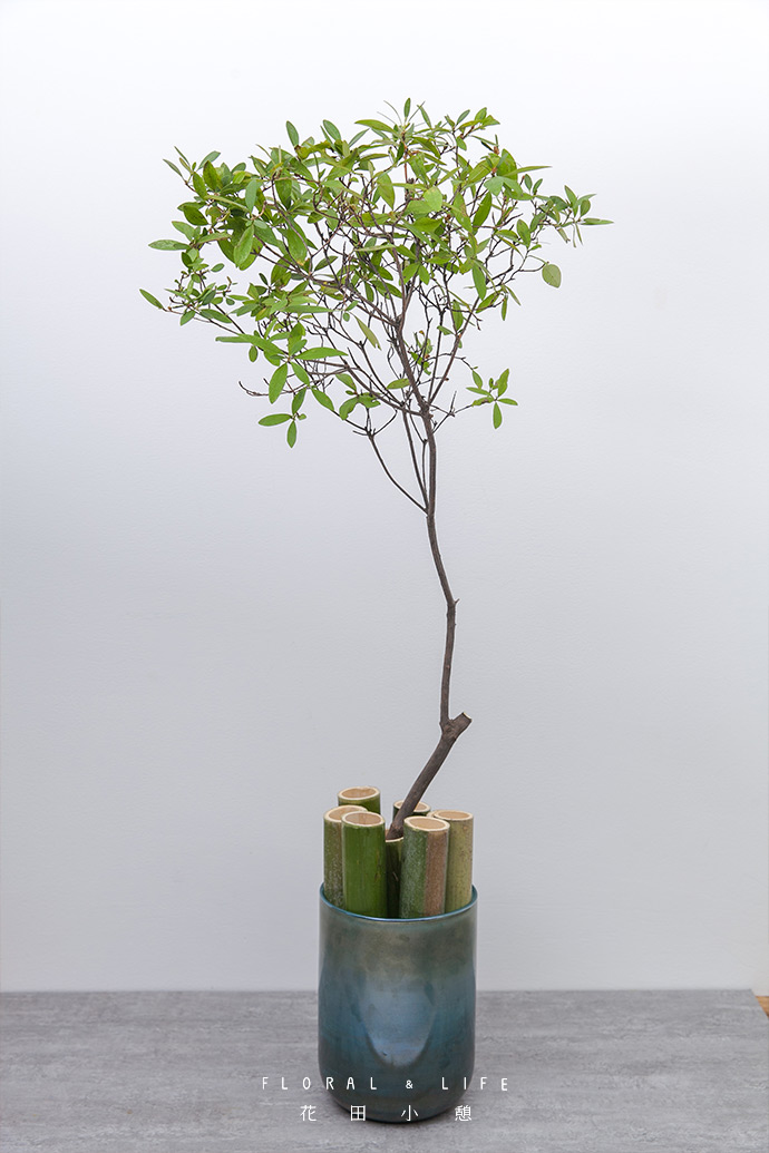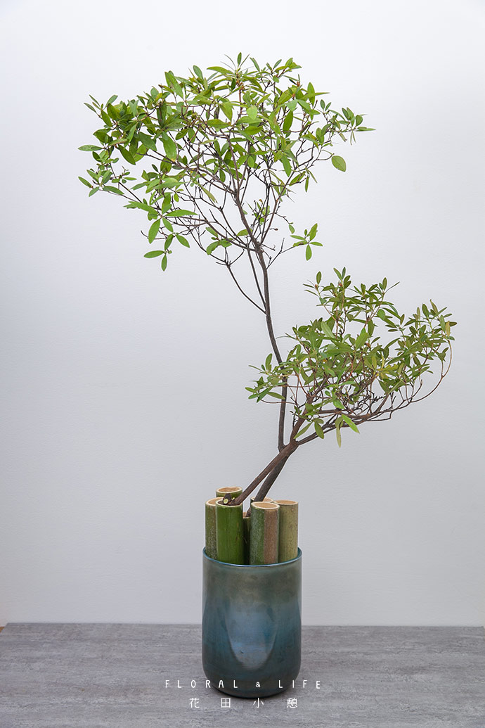 在另一个中空的竹子里加点小支的小叶杜鹃,与大支的小叶杜鹃构成一个中式的插花造型。