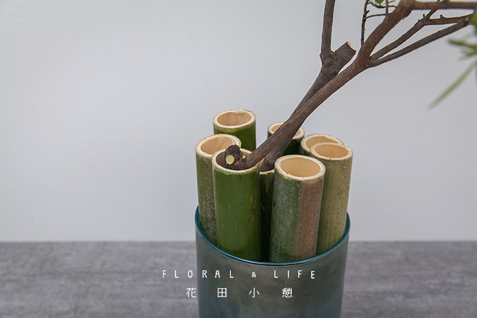 往竹子中添清水,蓝色花器与绿色竹子相互映衬,中空的竹子更能增添作品的意境美,隐形增高花器高度。